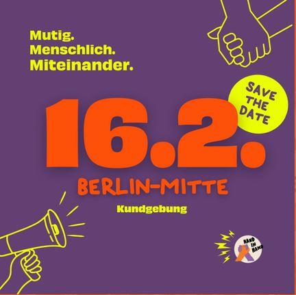 Das Bündnis Hand in Hand ruft auf, am Sonntag, den 16. Februar 2025, um 14 Uhr, Unter den Linden (Höhe Bebelplatz) gemeinsam auf die Straße zu gehen, um für eine sozial gerechte, zukunftsfähige und solidarische Gesellschaft einzustehen. Wir von INTEGRAL unterstützen diesen Aufruf und stellen uns auch entschieden gegen den von der AfD und anderen rechten Kräften geschürten Hass, die Hetze und Ausgrenzung.
