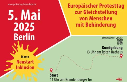 Am Montag, den 5. Mai, um 11 Uhr startet die Kundgebung am Brandenburger Tor und erreicht um 13 Uhr das Rote Rathaus. Der 5. Mai ist ein Tag der Solidarität und des Engagements! Integraler*innen mit und ohne Behinderungen setzen sich dafür ein, dass Menschen mit Behinderungen die gleichen Rechte und Chancen erhalten - sowohl hinsichtlich der beruflichen als auch der gesellschaftlichen Teilhabe. Machen Sie mit!