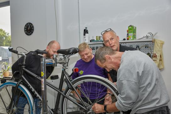 Bernd Jaschke von der Firma Siemens und Olaf Schäfer vom HVD (2. und 3. v. l.) lernten von den INTEGRAL-Mitarbeitern der Fahrradwerkstatt, wie man Fahrradketten richtig spannt.