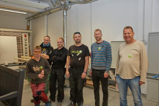Alexander Leins von der Firma Mercedes und Martin Forberger von Senatsverwaltung für Integration, Arbeit und Soziales (5. und 6. v. l.) führten vielfältige Arbeiten in der Holzwerkstatt aus.