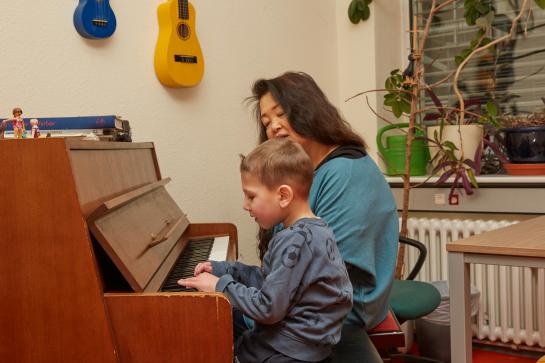 A. ist 4 Jahre alt und ein fantastisches Kind. Er freut sich ungemein, wenn er zur Musiktherapie im Sozialpädiatrischen Zentrum kommt und heute hat er vieles mit seiner Therapeutin Frau Hwang erprobt und erlebt. Mit ihr kann er sich in aller Freiheit austoben und sich alle möglichen Instrumente aussuchen.