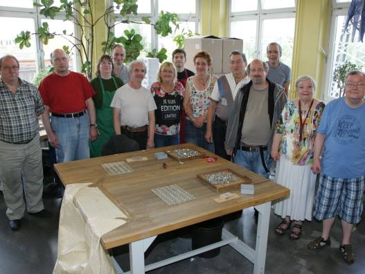 Wir stellen für unsere Kunden Verpackungen aus Pappe her. Das sind oft neue Formen. Dabei schneiden, falten und kleben wir.