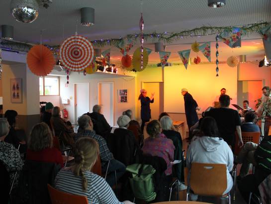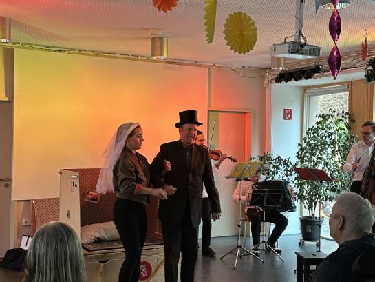 Das war ein schönes Ereignis, als die Komische Oper am 11.04.2023 zu Besuch im Begegnungszentrum für Menschen mit und ohne Behinderung war! Zum ersten Mal im Leben erlebten einige BGZ-Besucher*innen große Bühnenmomente. Gelacht, geweint und gesungen wurde zu lustigen Operetten-Duetten und zu den Arien aus Werken von Beethoven und Verdi.